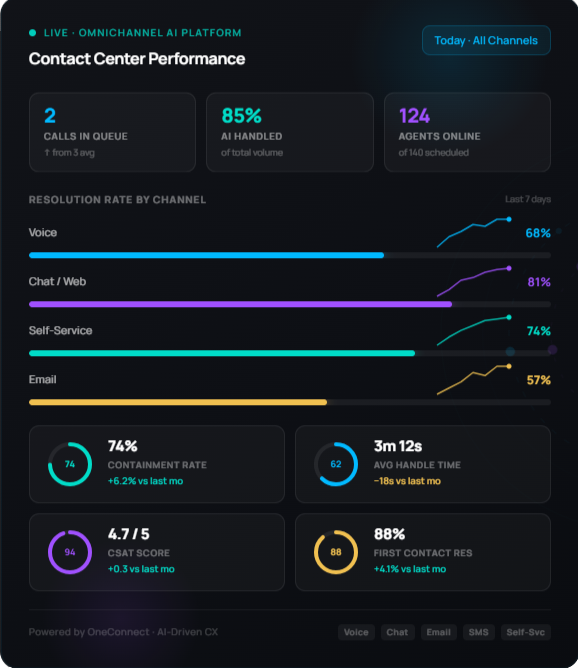 Voice, chat, email, and digital interactions are handled within a unified operational framework that preserves context.